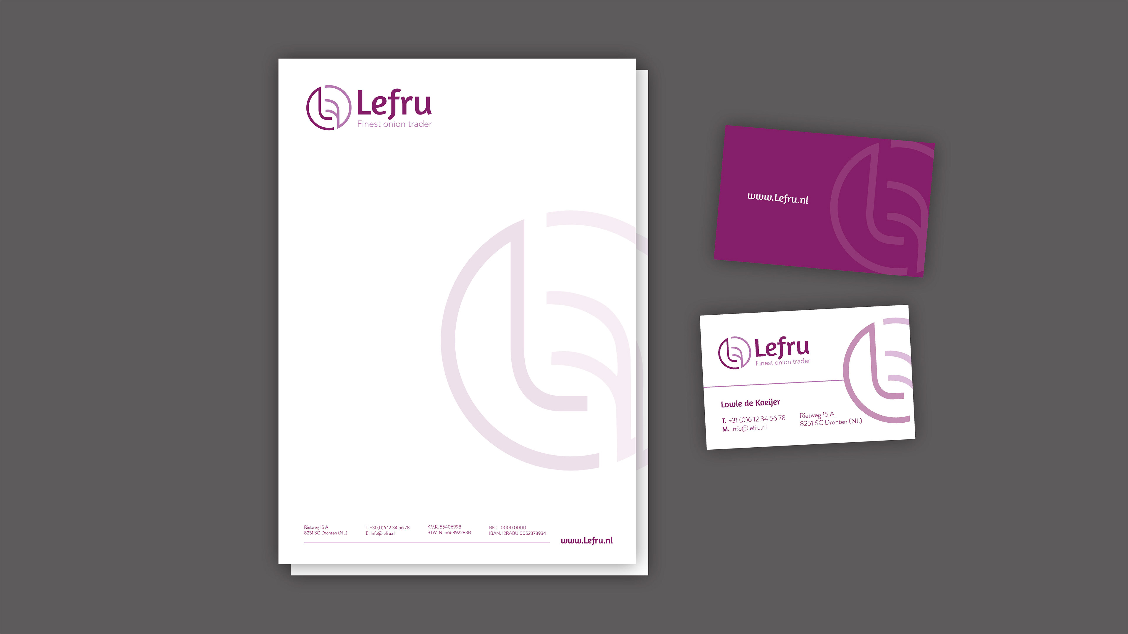 Bij mijn stage mocht ik een huisstijl ontwerpen voor Lefru, dat is een groothandel voor uien. Toen ze mijn logo/huisstijl hadden gekozen mocht ik ook nog hun visitekaartjes en briefpapier ontwerpen.