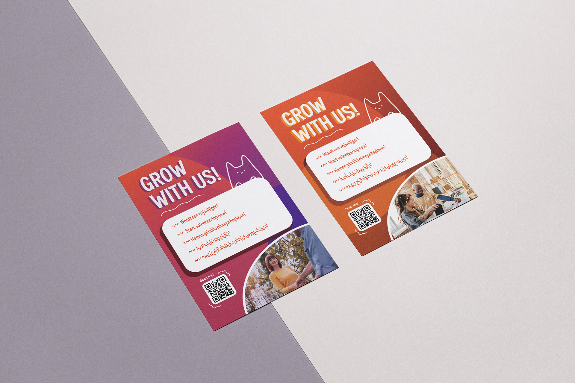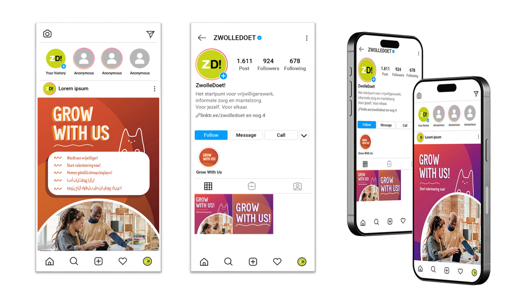 Vanuit school kreeg ik de opdracht om voor ZwolleDoet! een campagne te maken om nieuwkomers in Zwolle aan te sporen om vrijwilligerswerk te doen. Dit heb ik gedaan met behulp van posters, flyers en social media posts.